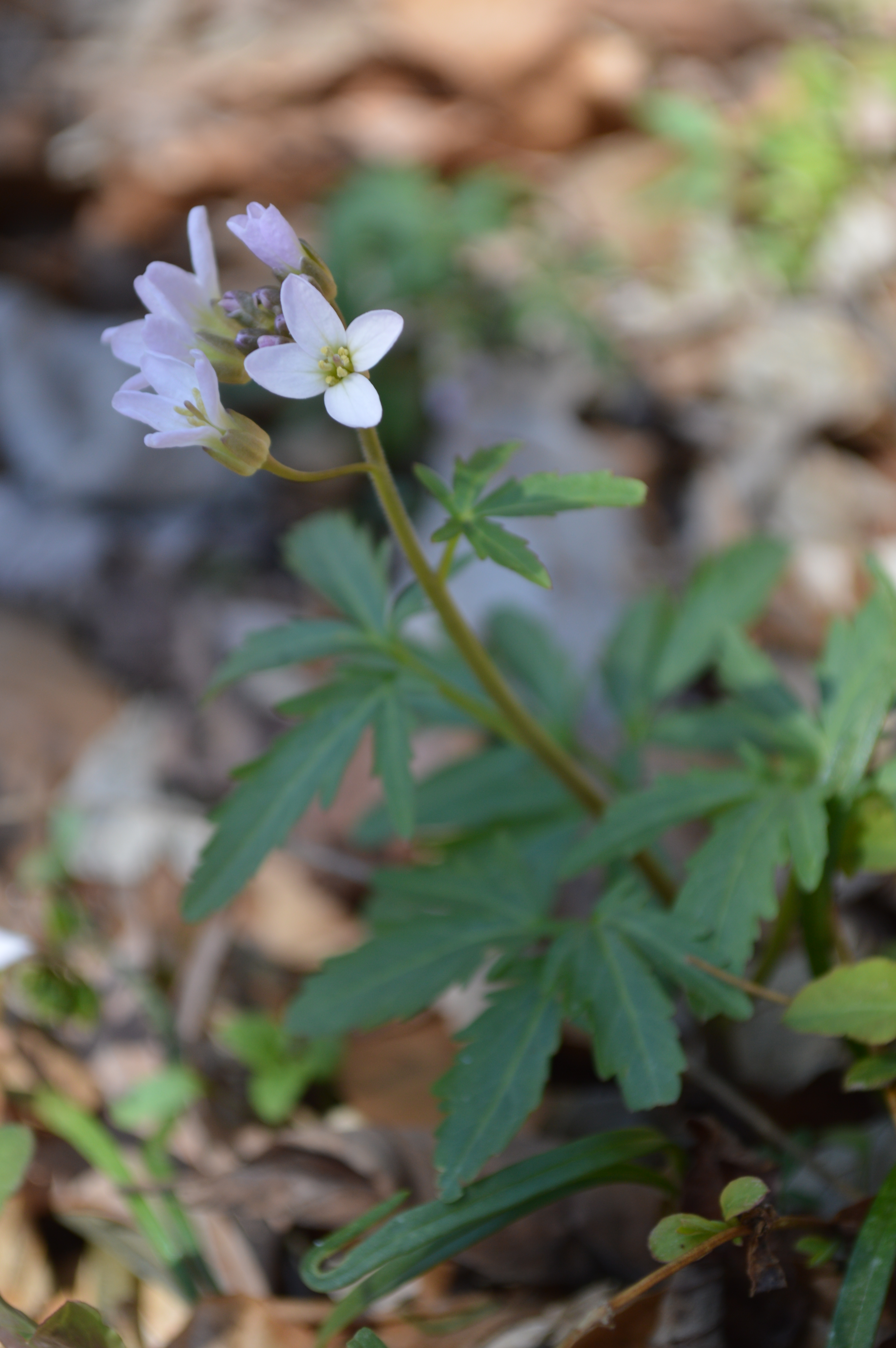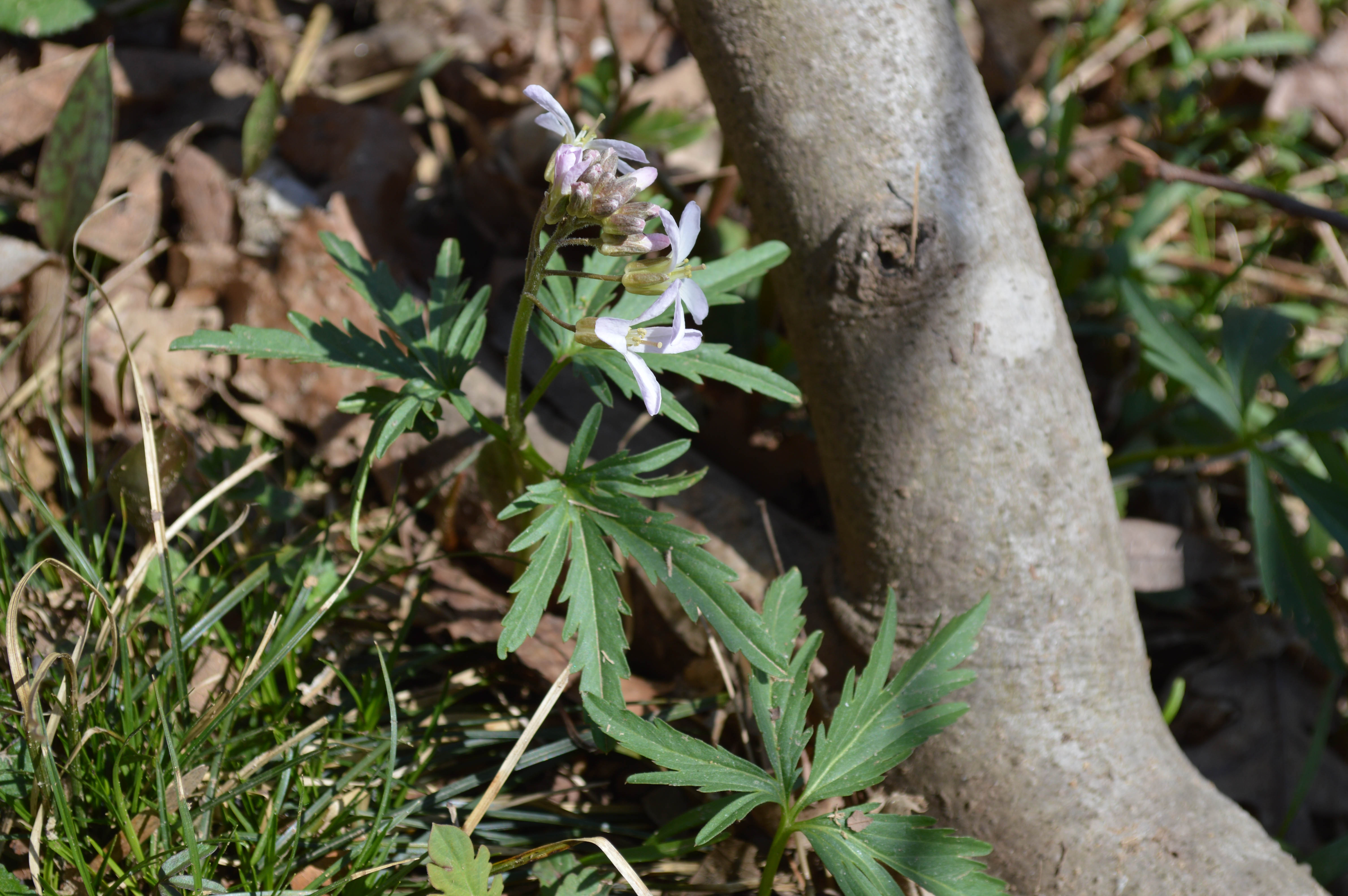 In forty-nine years of living in Montgomery County, I can’t remember a colder or snowier winter. I spotted the first wildflower of 2013 (a spring beauty) in mid-February. This year, it was mid-March before I saw anything. By the end of March I’d found a handful of spring beauties, a single squirrel-corn, some spicebush, and two different species of toothwort. The Virginia bluebells are a few days away from blooming (the buds are prominent), and the golden ragwort and early saxifrage are starting to bud, too. And I’ve seen leaves of early meadow rue, Virginia waterleaf, and trout lily poking up through the leaf litter, so there’s hope.