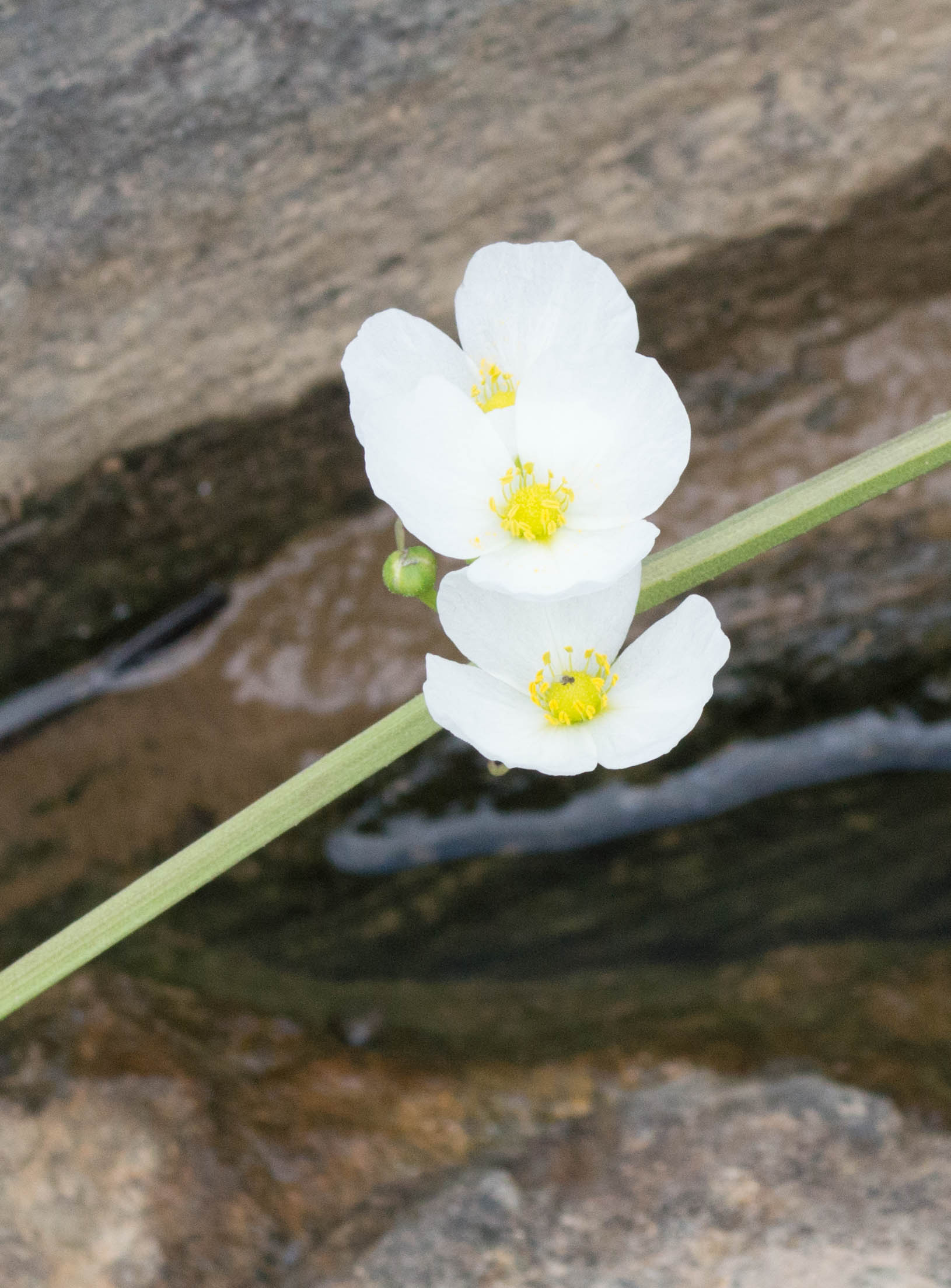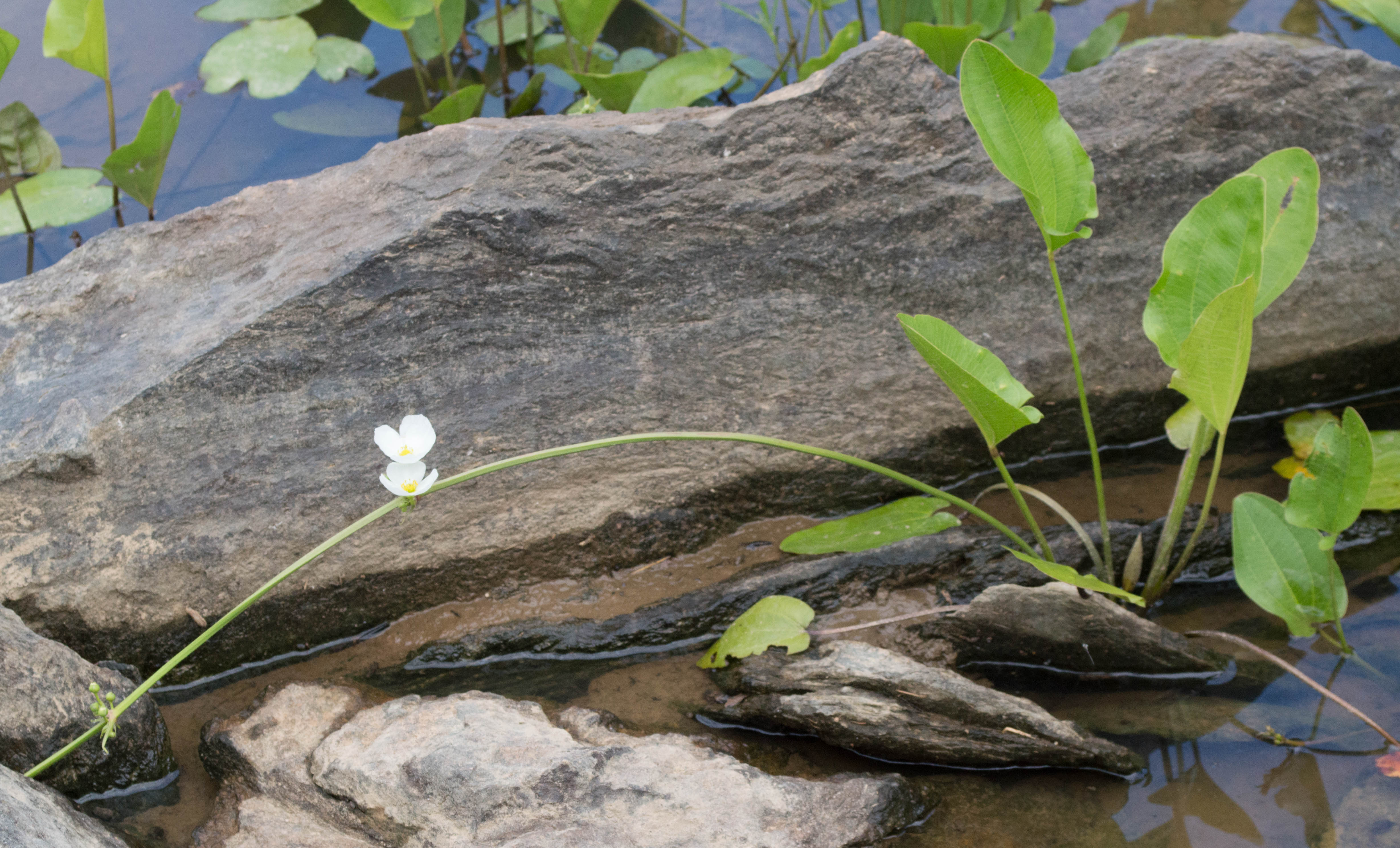 I found a stand of arrowheads in an unlikely place: halfway up one of the rocky bluffs that jut into the Potomac near the trail. This bluff had a lot of pockets, though, including one that looked wide and deep enough to stay wet (from flood or rain) year ’round. And so, a small rocky pond 15 feet above river level.