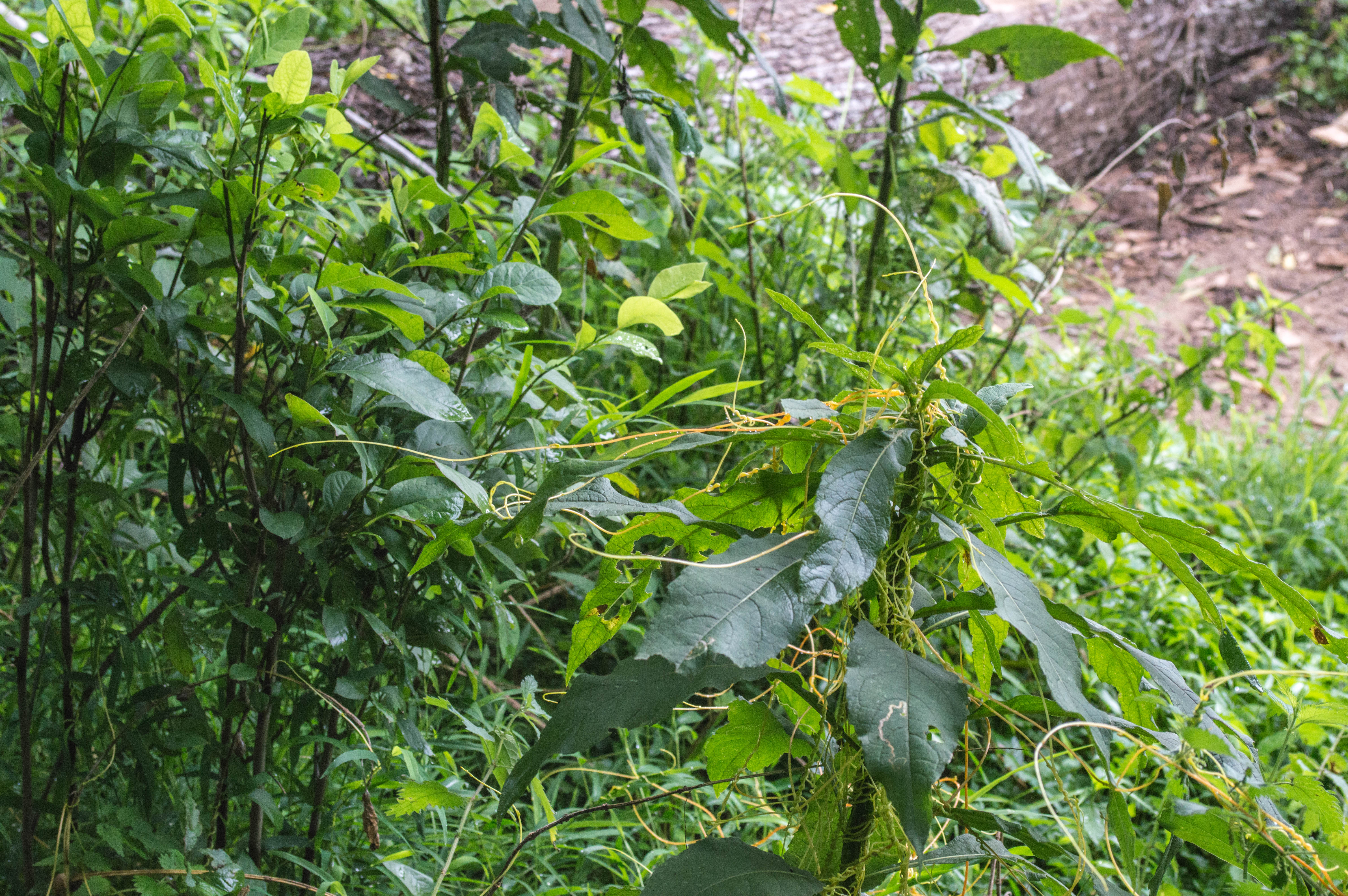 See that tangled mess of yellow and orange threads? That’s dodder. It is actually a flowering plant, but it’s an obligate parasite, meaning it depends on a host plant for survival. Almost entirely lacking chlorophyll, the rootless and leafless stem emerges from the ground and finds a host plant to attach to, then wraps itself around the plant as it grows, penetrating the host in order to draw nutrition from it. Later in the season it flowers and sets seed, then dies.