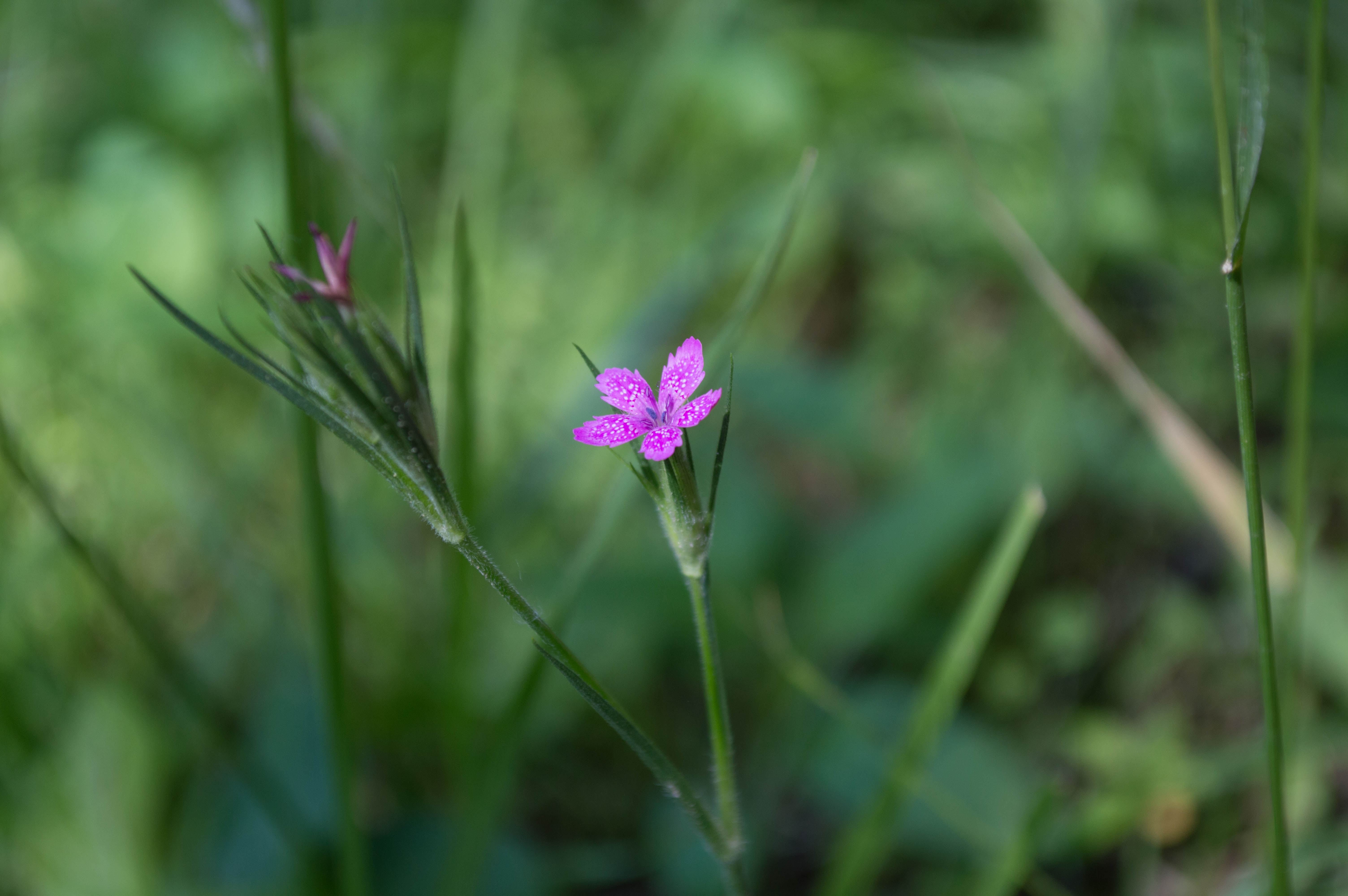 left, Deptford pink (Dianthus armeria), and right, nodding star of Bethlehem (Ornithogallum nutans), escaped garden ornamentals; I see more of them every year