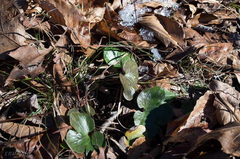 I wouldn’t have seen this plant if I didn’t know exactly where to look, for it was mostly covered by fallen oak and beech leaves.  Hepatica is a true evergreen forb: the leaves (in a basal rosette) re-grow after the plant flowers and last all year, until the next time the plant flowers.
