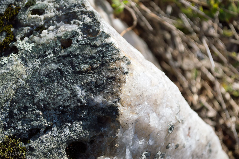 a particularly lovely rock, gneiss or schist on one half, quartz on the other