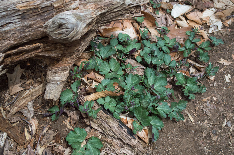 foliage: something that might be Virginia waterleaf (Hydrophyllum virginianum); something that be be an avens species; cleavers (Gallium aparine)