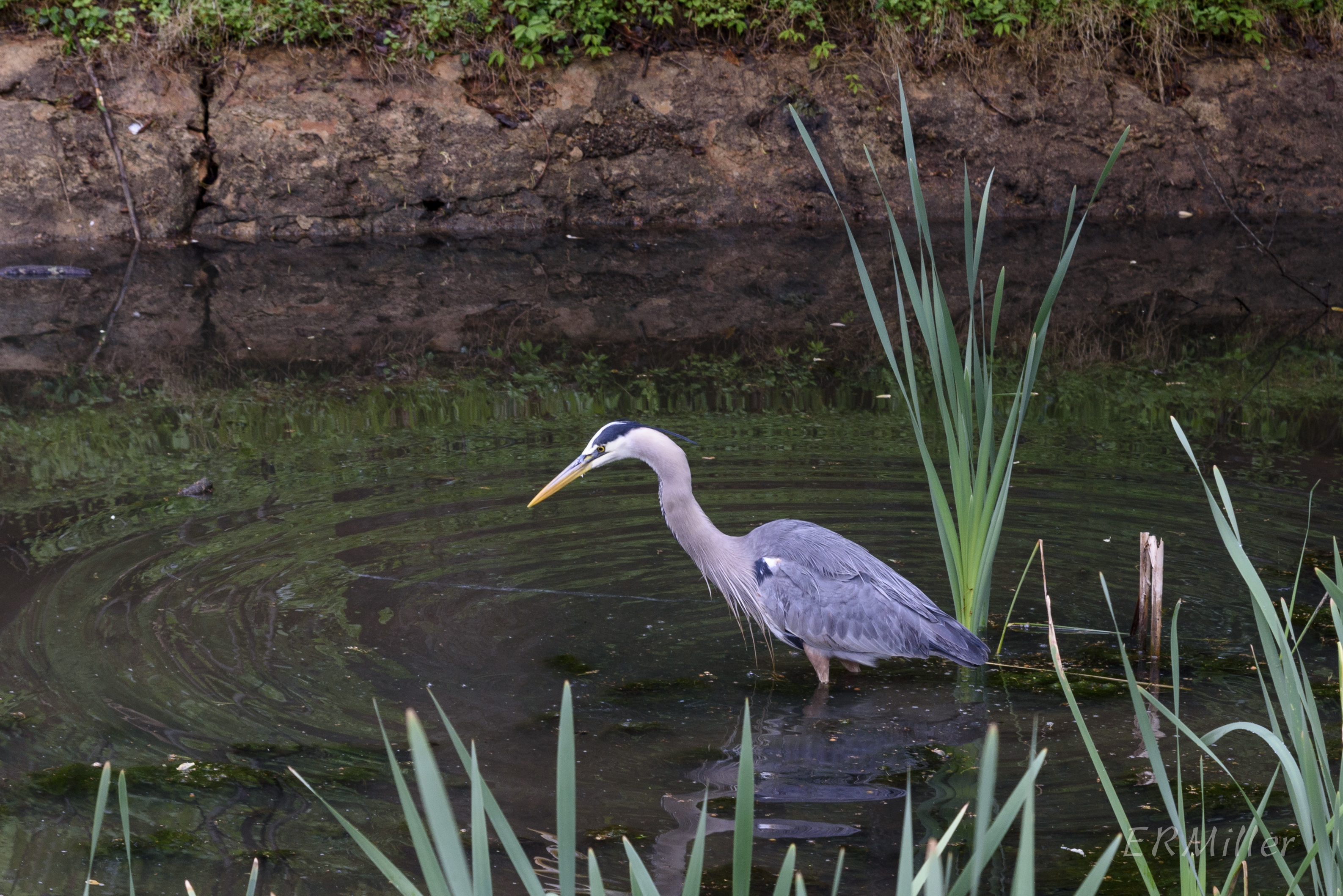 The great blue heron (Ardea herodias) is a large bird that lives year round in most of the continental US (excepting the desert southwest and the Rocky Mountains). It can stand up to 54 inches tall, and is most often seen wading in shallow water looking for fish, or flying low along streams, or on older Maryland license plates (“Treasure the Chesapeake”). In the air the silhouette is unmistakable.