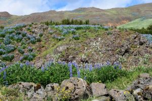 There’s a huge variety of grasses, rushes, and sedges, as well as mosses and lichens, and a good variety of boreal and alpine forbs. But there aren’t many trees. When Nordic settlers arrived in the late 800s CE, about one quarter to one half of the land was forested (mostly with birch species), but after a few hundred years of harvesting trees for building houses and ships, fueling iron smelters, and clearing land for sheep to graze, virtually no trees were left. Subsequent overgrazing by sheep led to serious degradation of the soil, so that many areas still have almost no plant life, and without plants to hold the soil in place the windy weather can create massive dust storms. Only about 1.4% of the total landmass is considered arable. Reforestation efforts have been under way since the mid-20th century, so there are small stands of trees dotted about, but there’s not much of anything like a forest.