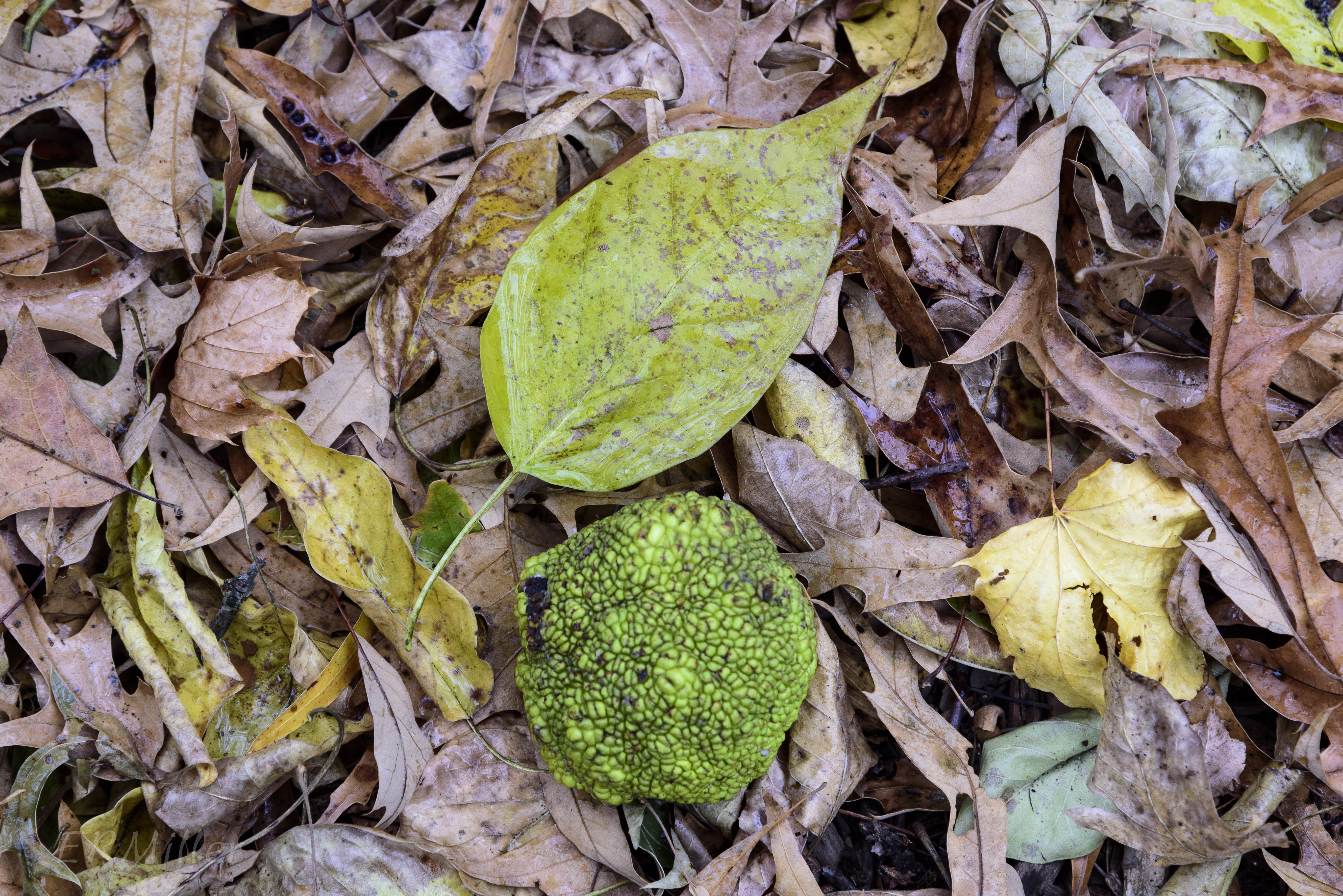 These fruits come from the tree Maclura pomifera, which goes by many common names, including the ones above (except brain fruit and monkey balls), yellow-wood, and bodark, a corruption of the French name bois d’arc (bow-wood). It’s in the mulberry family (Moraceae), which also includes fig (Ficus carica), jackfruit (Artocarpus heterophyllus), and breadfruit (Artocarpus altilus). Jackfruits are thought to be the largest tree-fruit in the world (they can weigh up to 80 pounds), and breadfruit saplings were the precious cargo on the HMS Bounty when the crew mutinied.