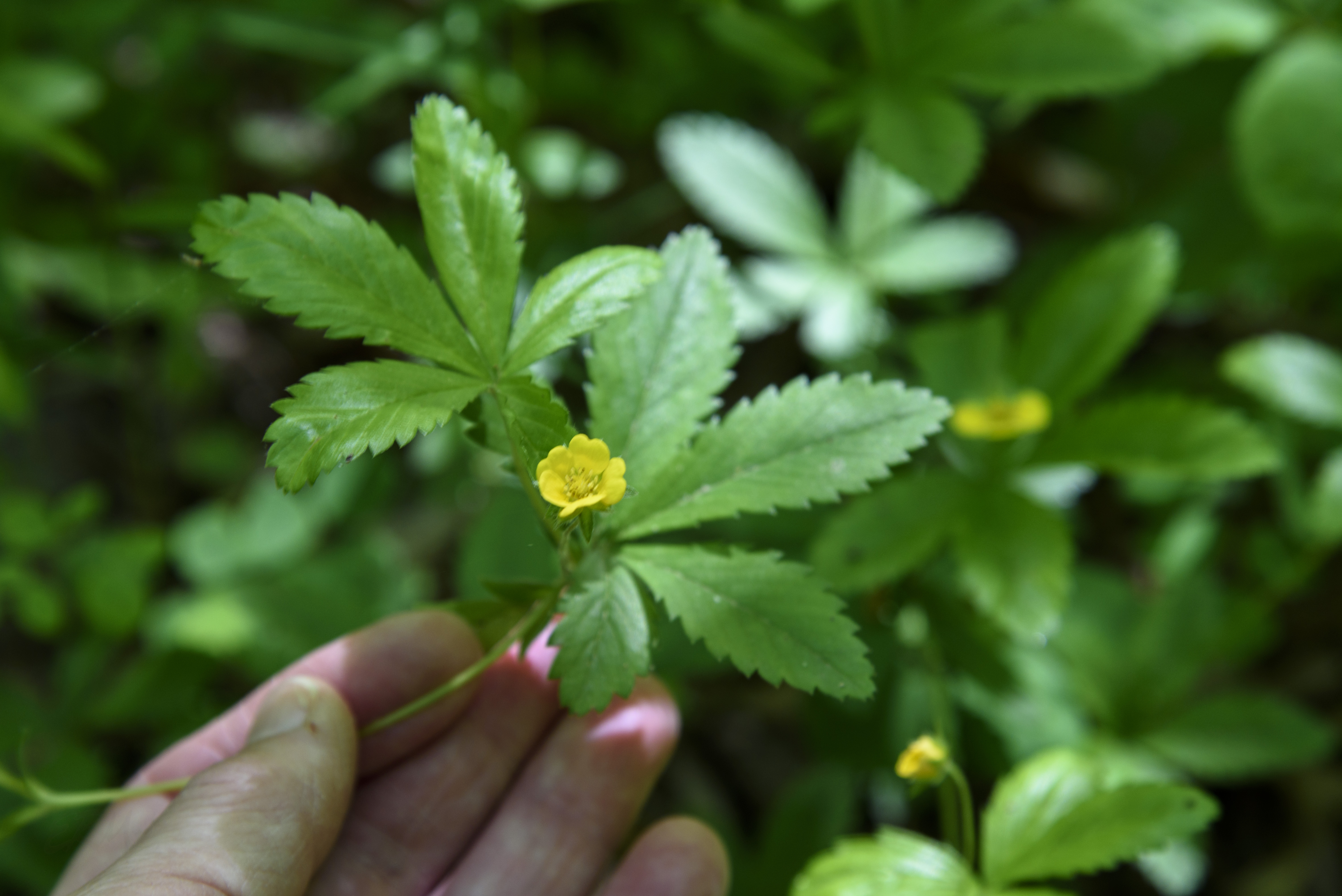These pictures show an obvious difference between the Potentillas and Duchesnea: the former have five leaflets (hence the common name cinquefoil), while the latter have three leaflets.