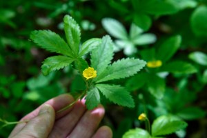 Another look-alike is in the same family but a different genus… for now. Recent research suggests that Duchesnea indica, false or mock strawberry, should be considered a Potentilla*. A very common lawn and garden weed, and a weed of natural areas as well, it produces fruit that isn’t edible. Well, technically it is edible- it’s not poisonous – but the strawberry-like fruits are flavorless.