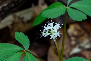 Dwarf ginseng grows in similar habitats to miterwort, with a similar but more northern range in North America. Fun fact: according to the Illinois Wildflowers site, not only is dwarf ginseng polygamo-dioecious (with plants bearing either staminate or perfect flowers) but “individual plants are capable of changing their gender from year-to-year”.*