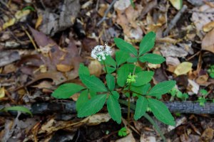 A much shorter plant, also easily overlooked, Panax trifolius (Araliaceae) is somewhat misleadingly named: the leaves often have five leaflets, though two of them are quite small. Dwarf ginseng is not the ginseng of commerce: that’s Panax quinquefolius, which also has five leaflets, but the leaflets have short stalks (petiolules), which is one way to tell the plants apart.