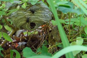 That’s a nest, with two bald-faced hornets (Dolichovespula maculata) entering. It was all I could do to get the camera up for a really quick shot before getting the heck away from there.