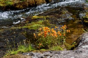 Mimulus guttatus (yellow monkeyflower, Phrymaceae), an introduced species, growing along a creek in Gjógv