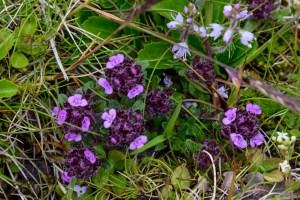 Thymus praecox (creeping thyme, Lamiaceae), with a Veronica species (possibly V. officinalis) and a Galium species (G. saxitile?)