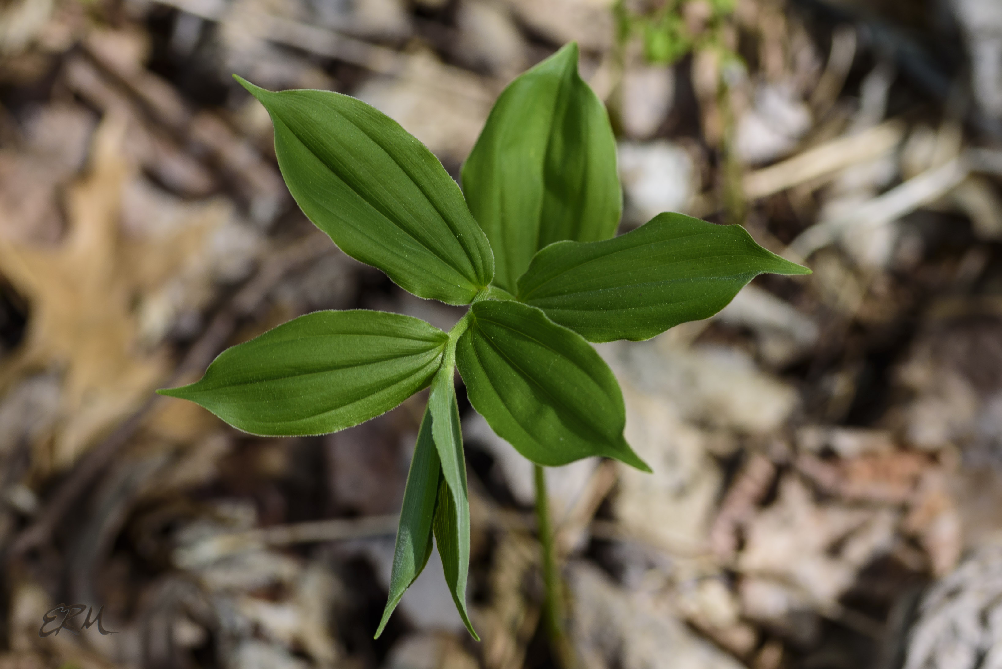 Sessile bellwort is much smaller than M. racemosum and P. biflorum. Its terminal bud develops very early, when the plant is still tiny. Especially if the other two species are nearby, it’s pretty clear from the size and general appearance if a young plant is a bellwort.