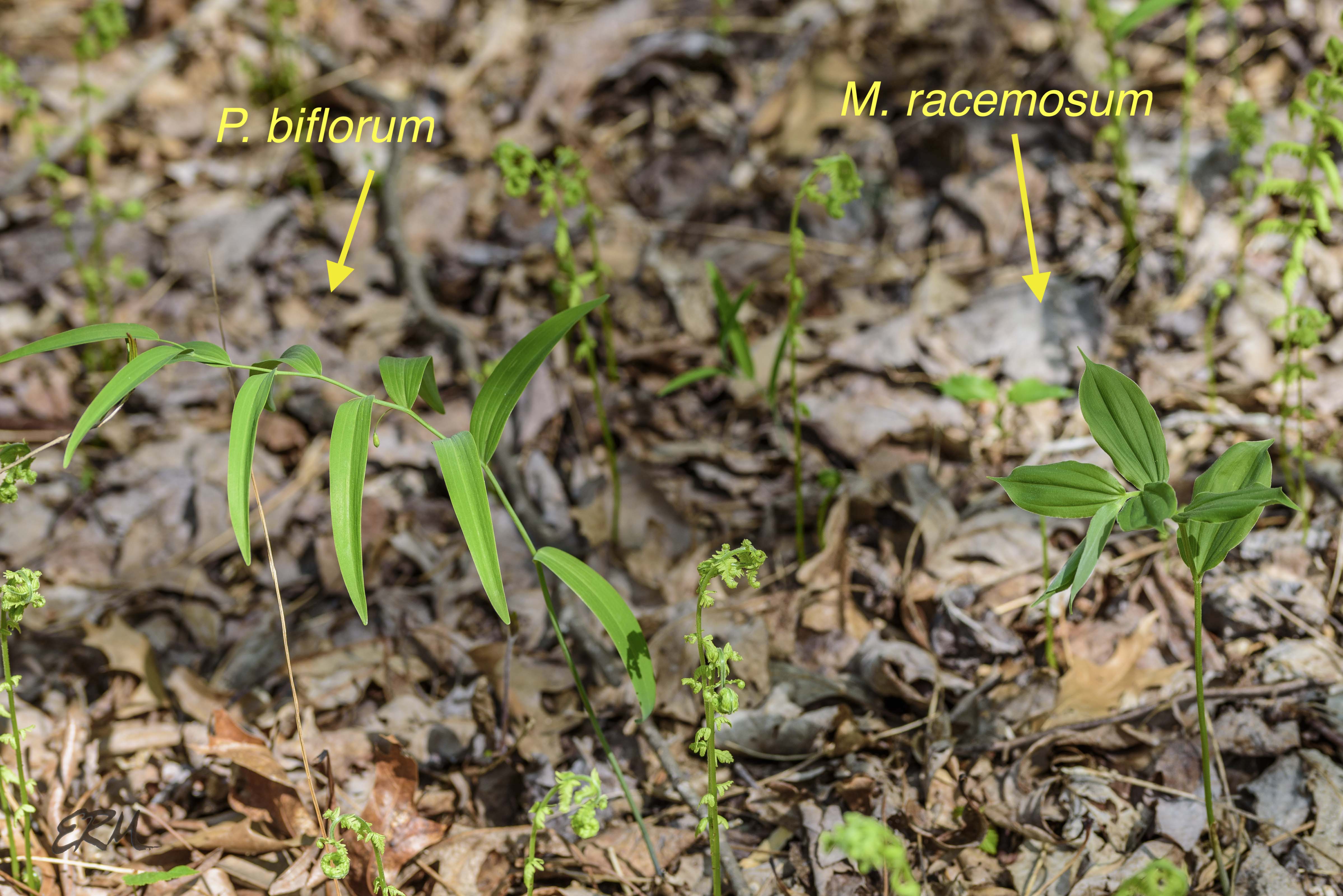 Perhaps the best way to distinguish M. racemosum from P. biflorum when the plants are very young is to look at the leaf tips. When the plants are a little older, they’re very easy to tell apart by looking for buds: M. racemosum has a cluster of buds at the very end of the stem, while P. biflorum will have a few buds at many (but not all) of the leaf axils.
