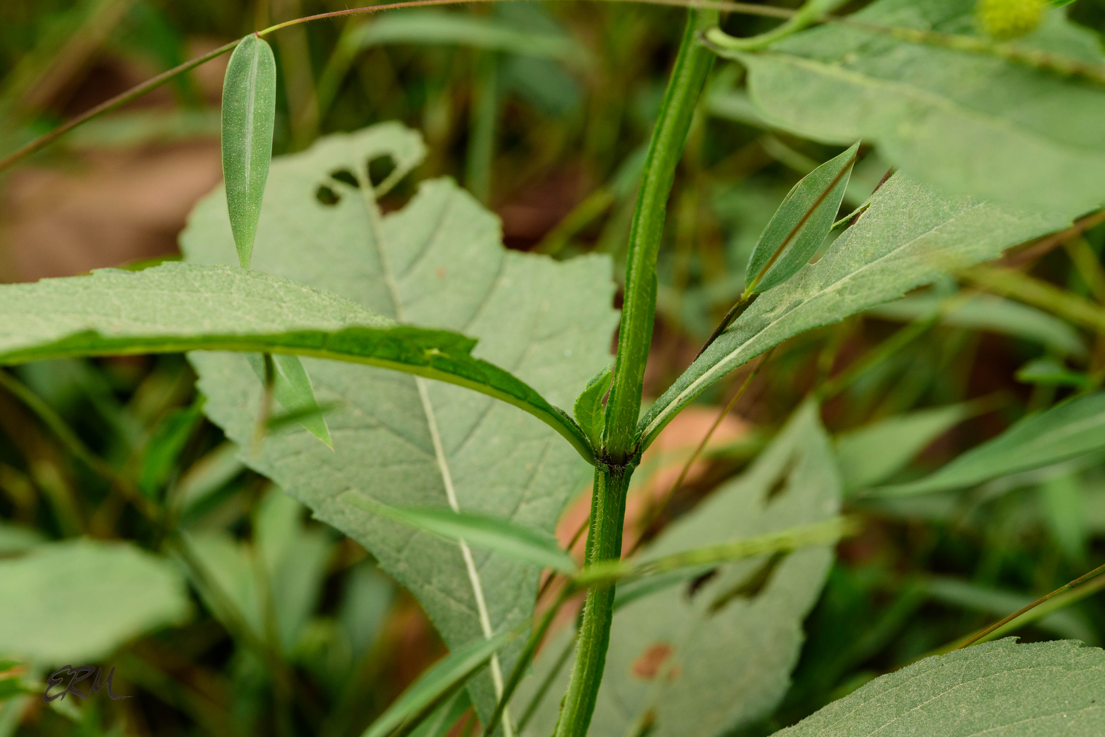 very similar in appearance to Verbesina alternifolia. V. alternifolia has alternate leaves that are more lance-shaped, and usually has more than 2 ray florets per head, while V. occidentalis has opposite leaves that are more oval, and only 1 or 2 (sometimes 3) ray florets per head