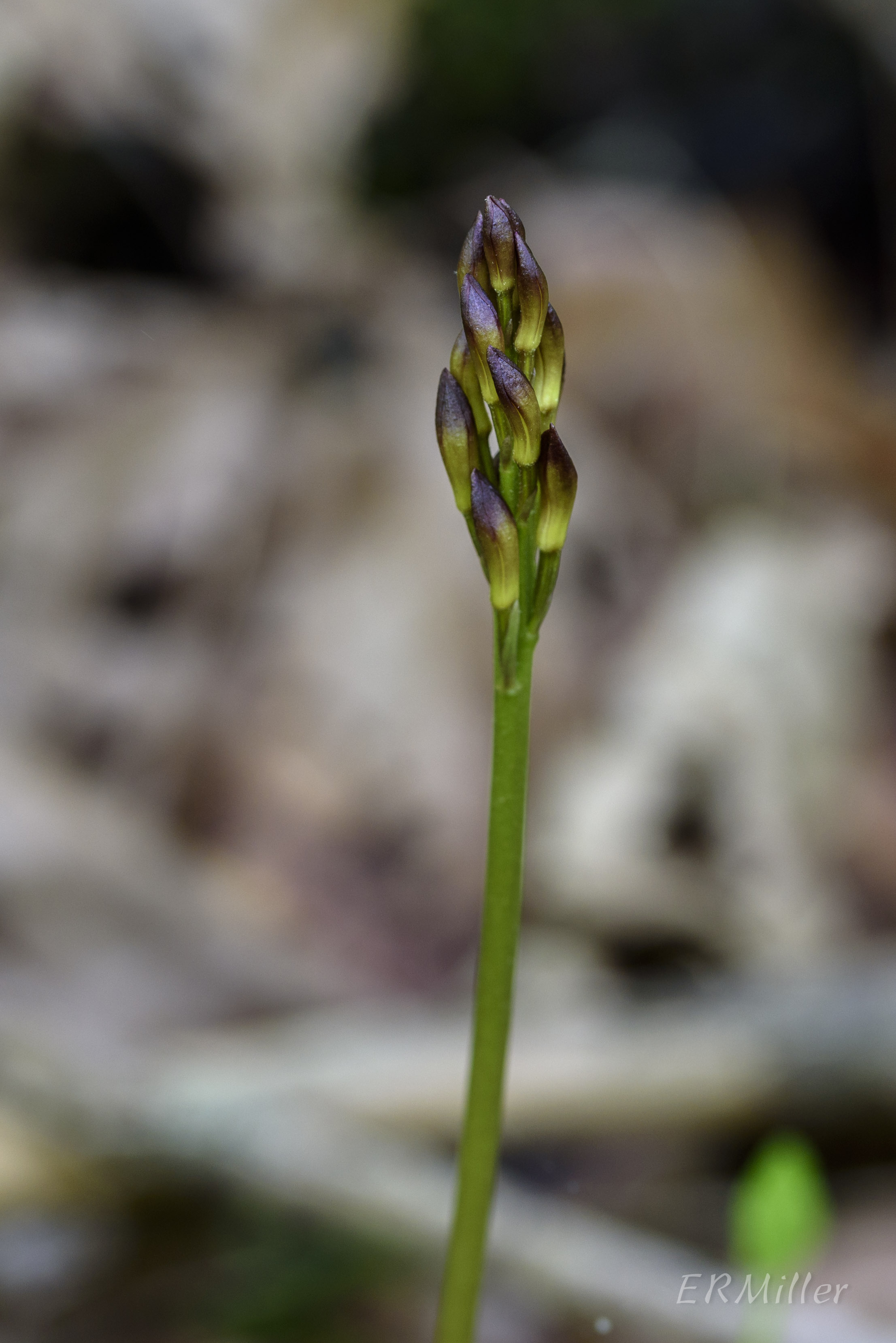 A few days ago I ventured out again (more about that soon), and unexpectedly found a single specimen of yet another orchid, Aplectrum hyemale. Putty root, also known as Adam and Eve, is hibernal: each plant produces one leaf in the autumn that persists through the winter and into spring, then dies before the plant sends up a single shoot that bears about 15 flowers. According to the Go Orchids site, putty root seems to be found near sugar maple and beech trees. I’ve only seen it in deep shade, which makes it difficult to photograph.