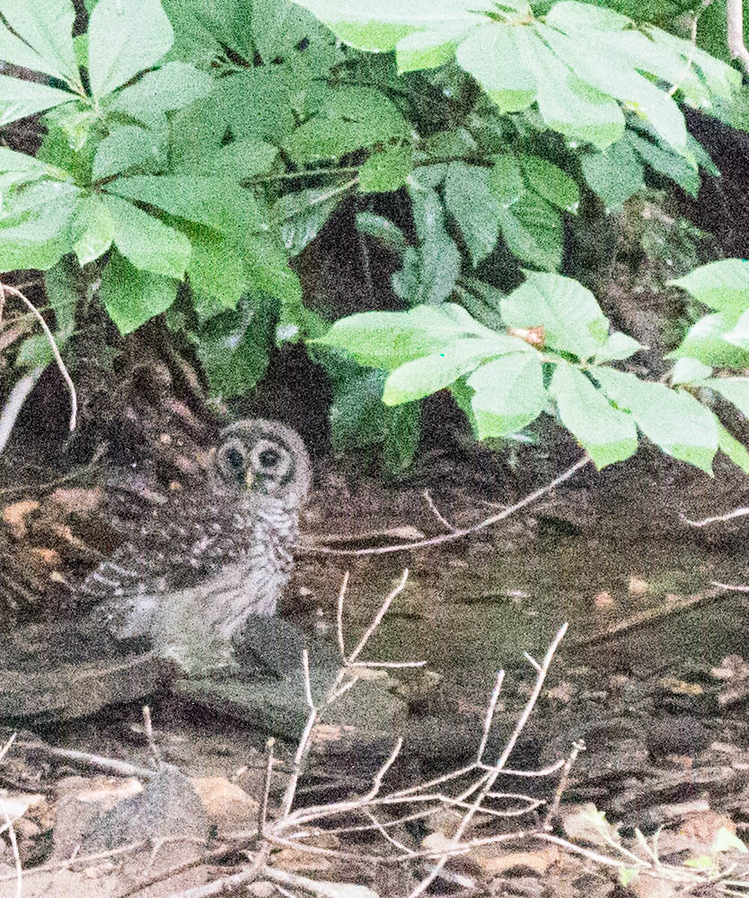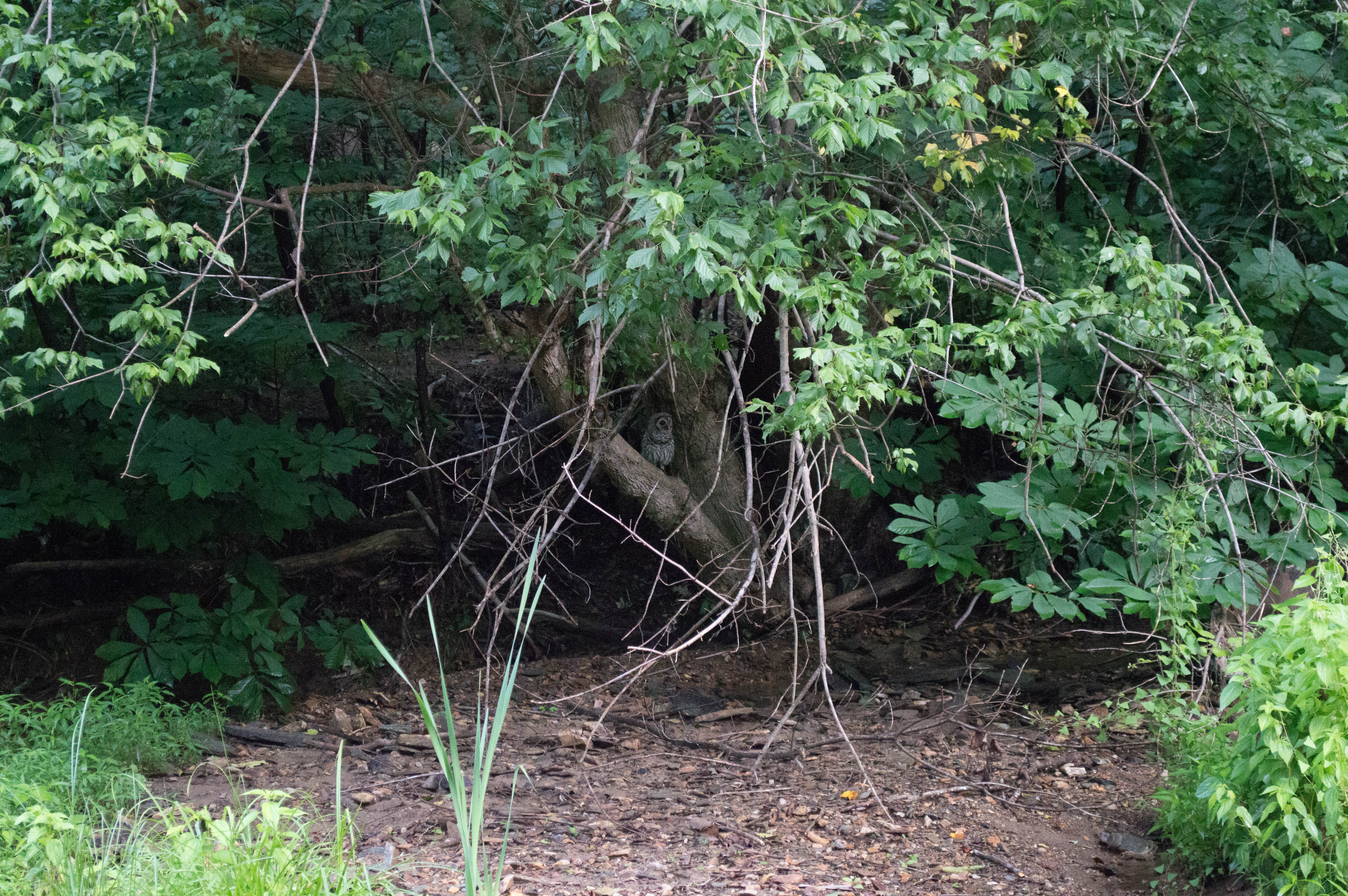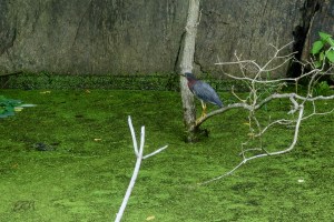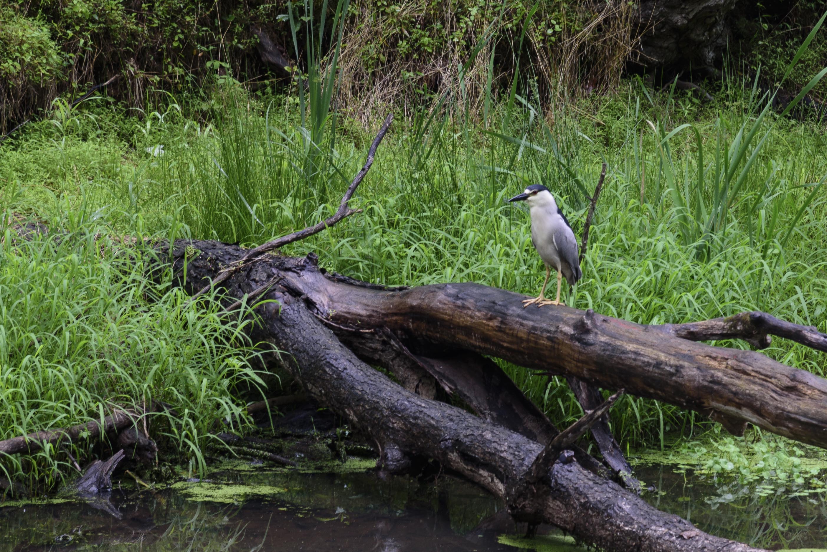 This is a black-crowned night heron (Nycticorax nycticorax), a bird that isn’t usually seen in the middle of the day, but they sometimes come out when it’s overcast and rainy. This one hung out on the log for awhile, eventually working its way down to the water. I think it was fishing.