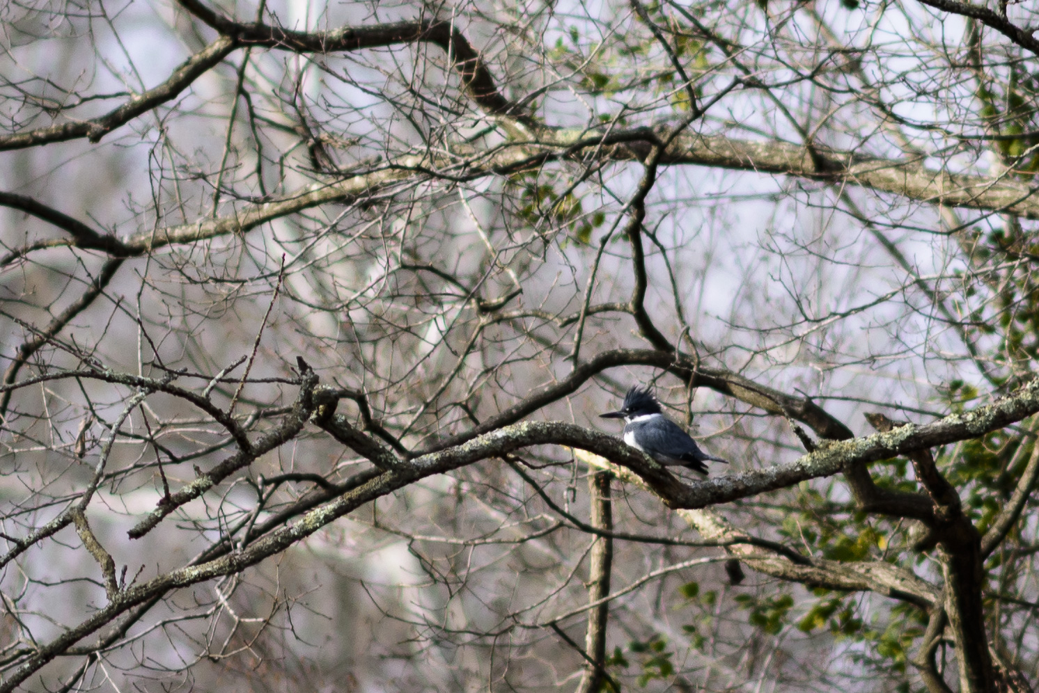 Speaking of long lenses, last January a friend loaned me one, and with it I was barely able to capture a belted kingfisher (Megaceryle alcyon) perching in a tree, then cruising along the canal.