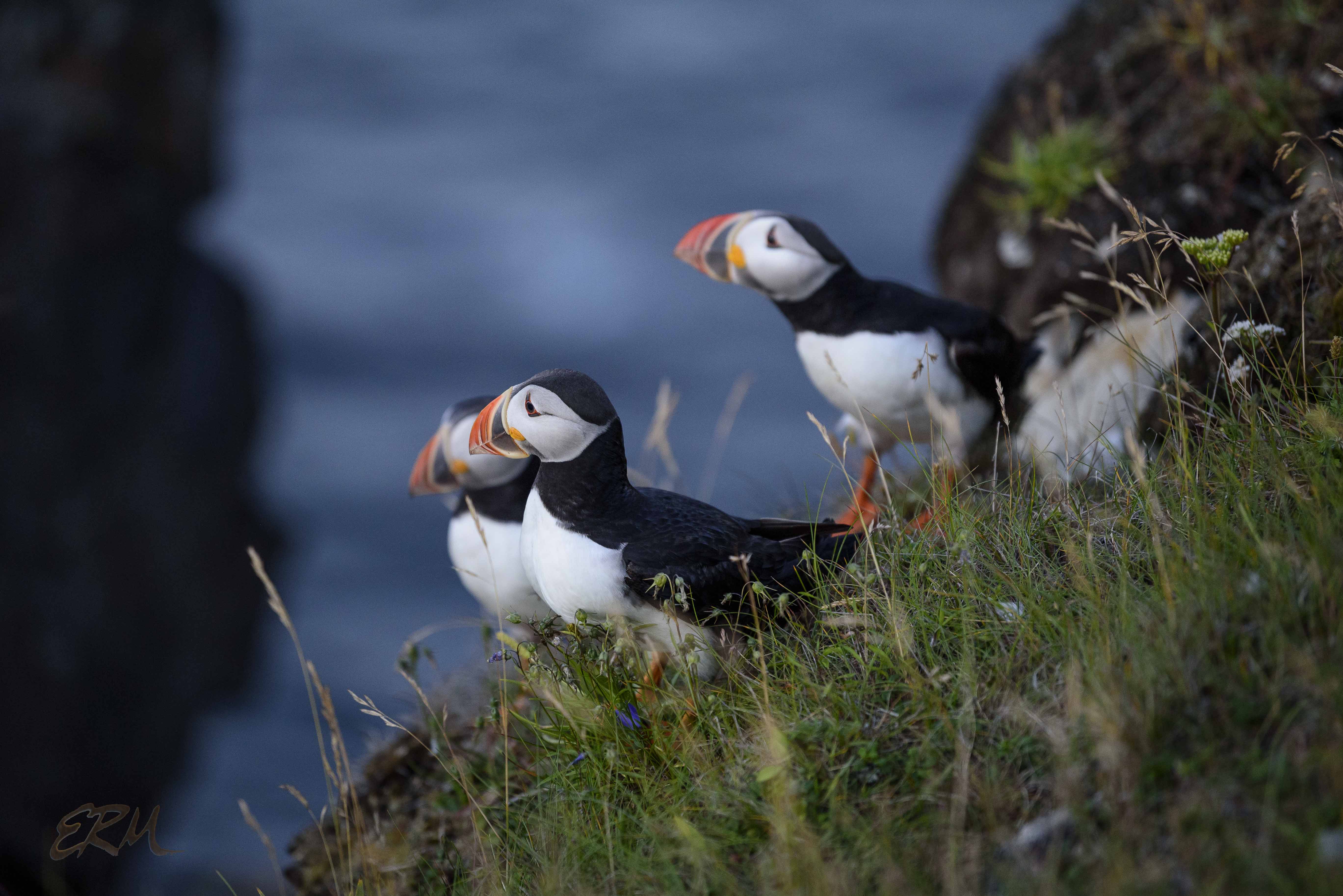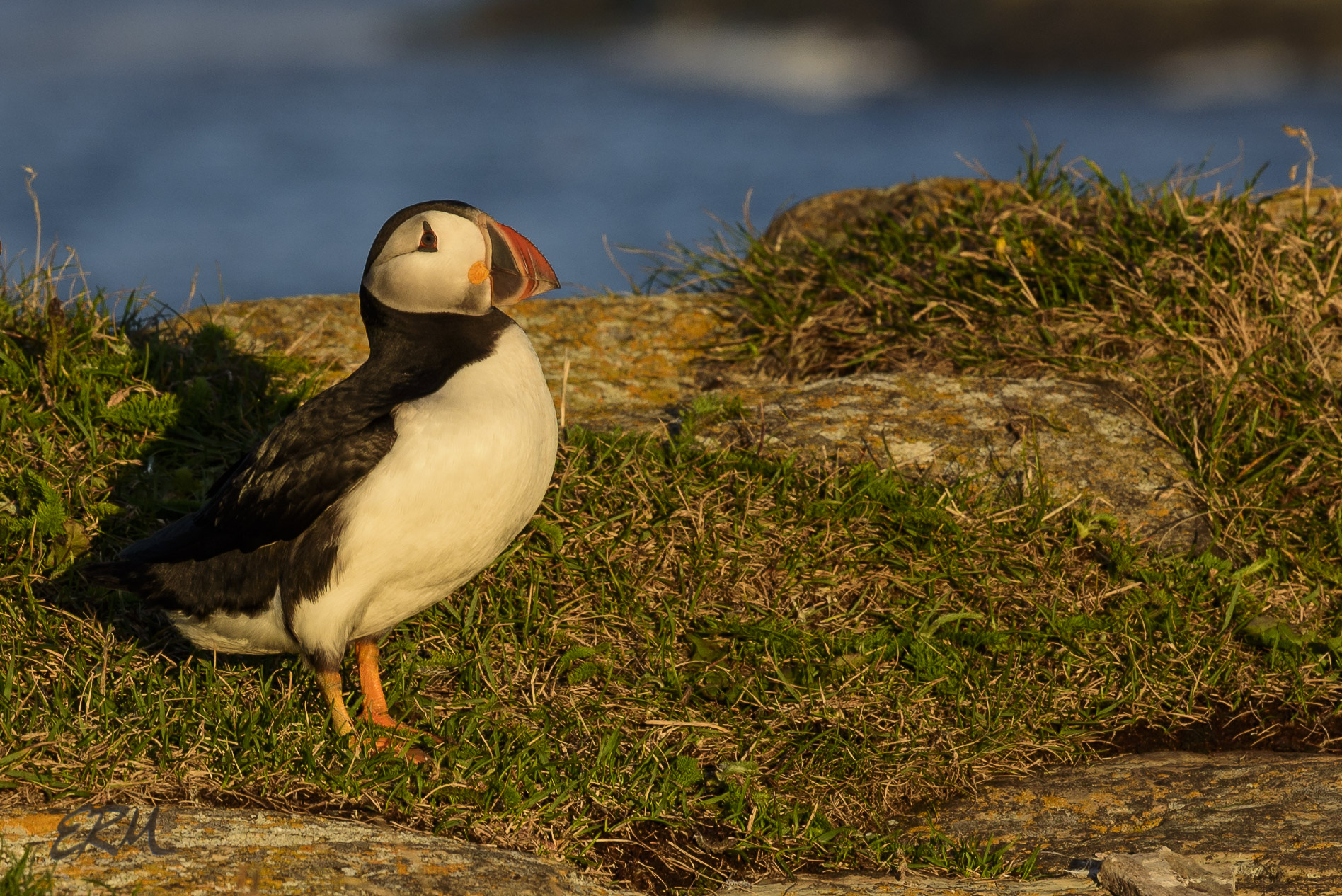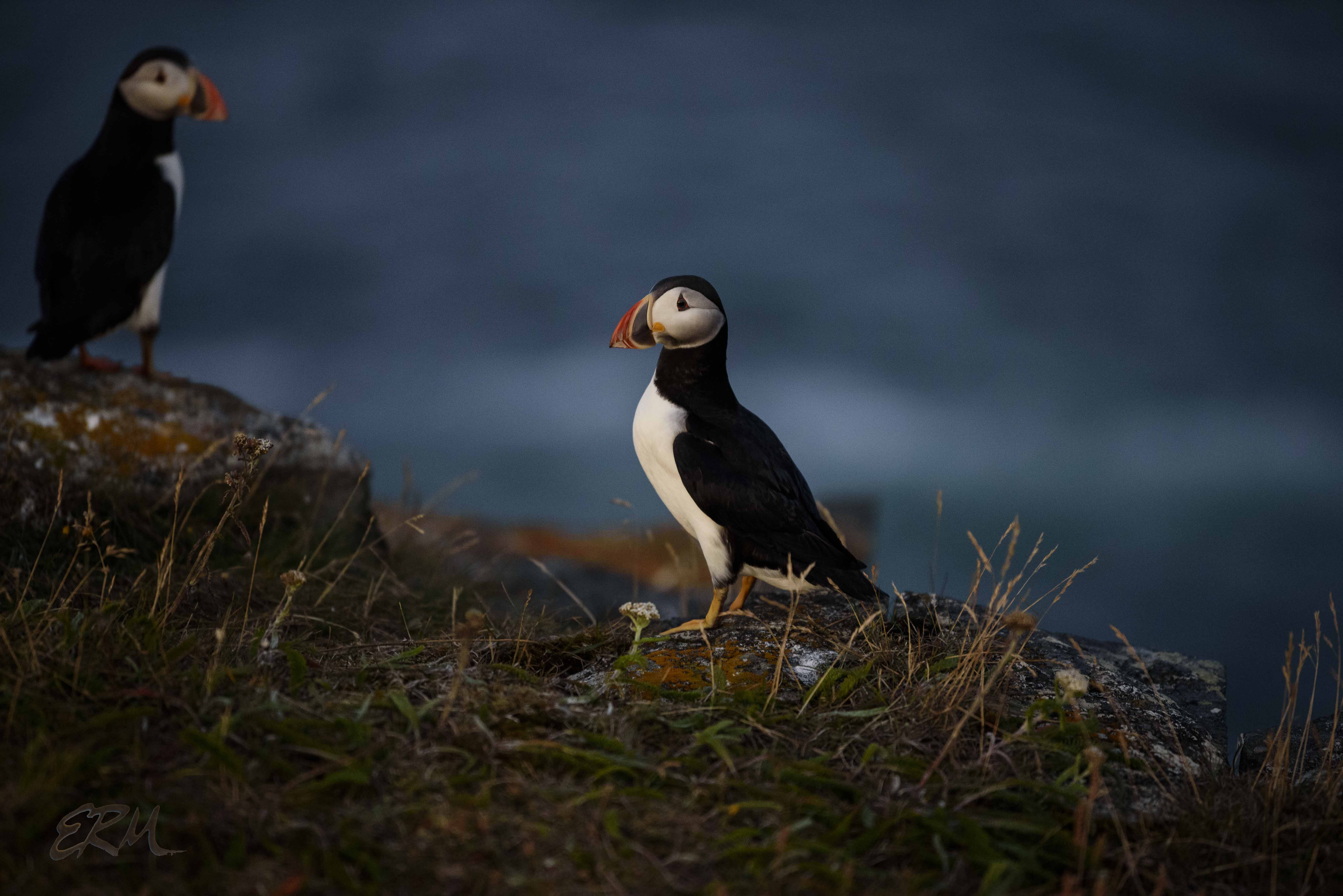 On the third evening first one and then another photographer joined me in the grass on the little hillock. They were both disappointed that the birds were far away on their islet. I advised them to be patient, wait for most of the people to leave, then get ready. Once again I got the remaining peoples’ attention, got them to be still and silent, and once again the puffins came and perched on the ledge.