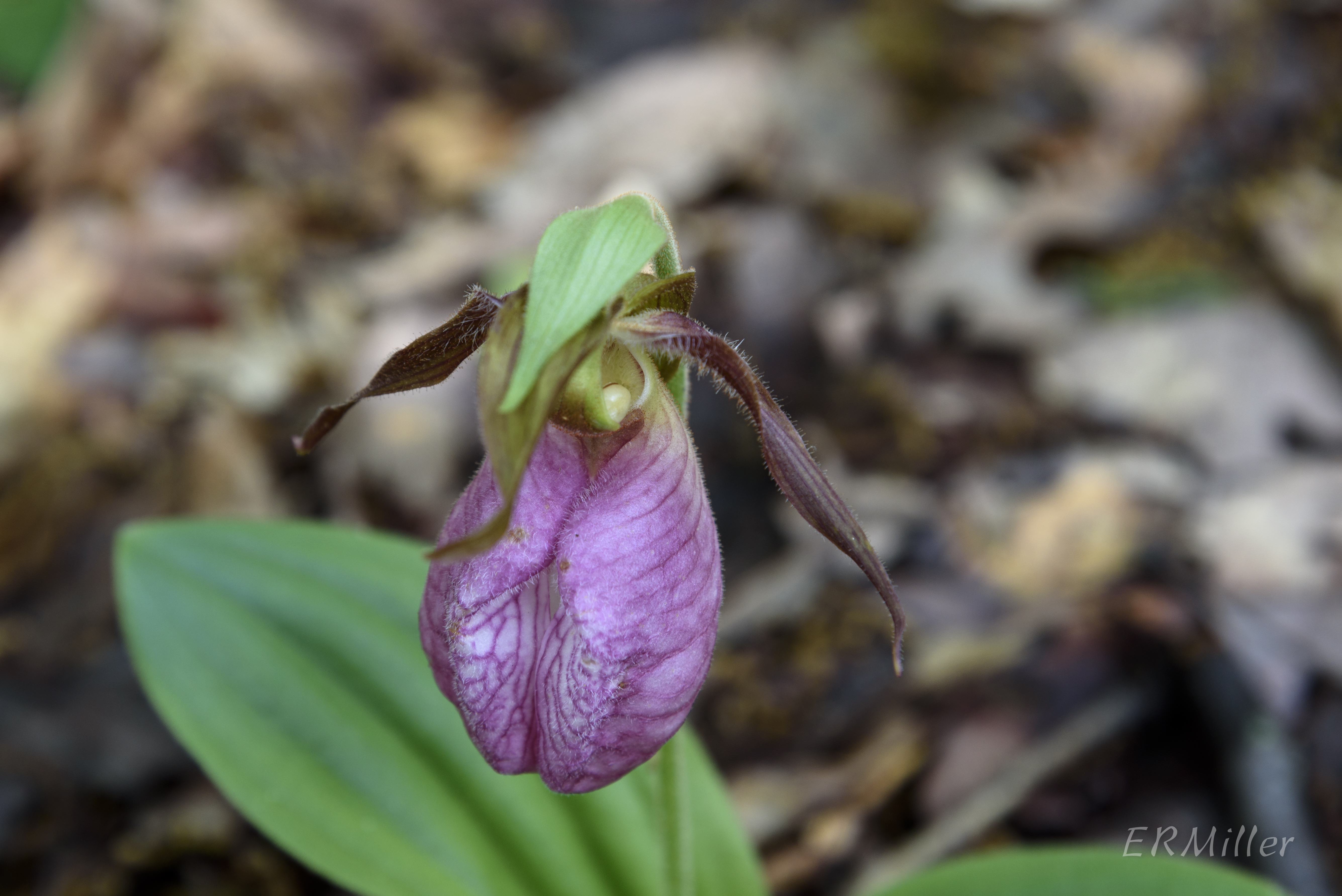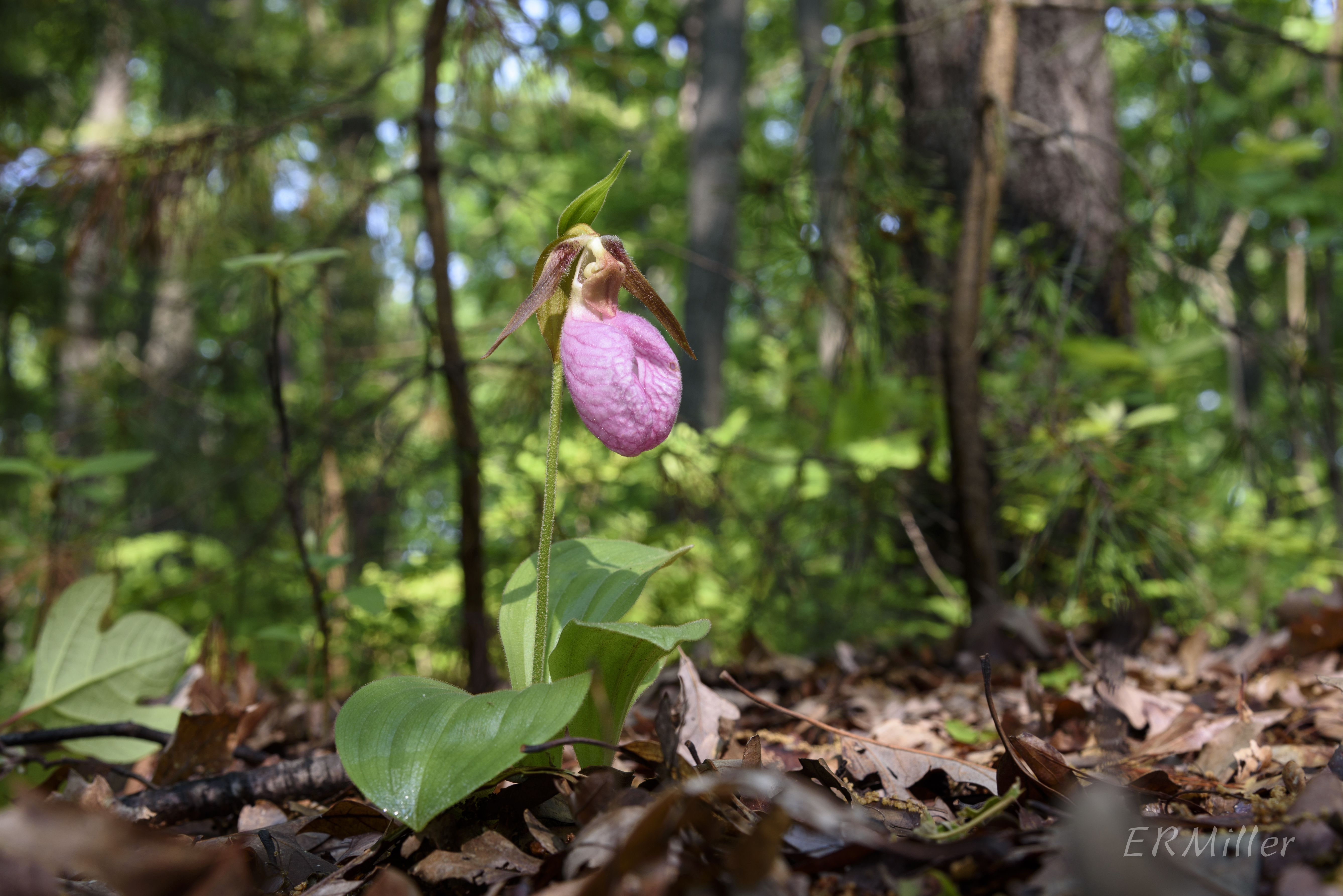 A week before the pilgrimage to find large whorled pogonia, I’d found a few nice stands of showy orchis. It’s fairly common in dry-to-moist woodlands of the Maryland Piedmont, but it’s on the RTE lists of Maine, Michigan, New Hampshire, New York, and Rhode Island. I noticed while doing a quick web search that the name “orchis” (with the “s”) isn’t used often anymore; now it’s called “showy orchid”. This species used to be known as Orchis spectabilis, but recent taxonomic changes now have it as Galearis spectabilis. The common name “showy orchis” is just a translation of the old Latin name. You’ll find it under that name in older wildflower guides.