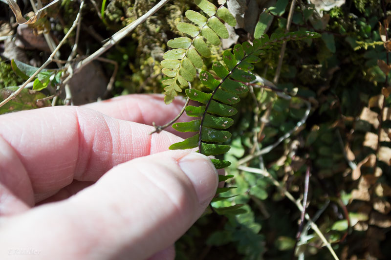 Right, one of my favorites: ebony spleenwort (Asplenium platyneuron). Below, a forefinger held up to the same plant.