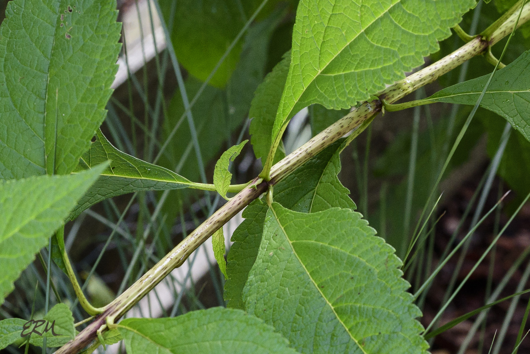 Here’s where it’s easy to tell the difference. Both plants have opposite leaves (mostly). The leaves have petioles, but the leaf shapes are distinctly different. E. serotinum has lance-shaped leaves that often curl in a bit at the edges. A. altissima has more-or-less ovate to heart-shaped leaves. Keep in mind that, as with so many aster-family plants, the leaves tend to get smaller and more linear further up the stem, and near the inflorescence they can be alternate rather than opposite.