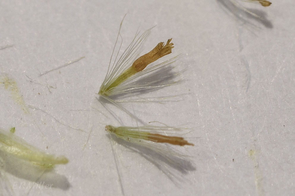 About the flowers… Remember that plants in the Asteraceae have composite flowers. That little thing next to the ruler in this picture, measuring only about five and a half millimeters long, is a flower head – a collection of flowers. At least, it was, as these had all turned to seed. I was able to cut some open and tease out the seeds. I didn’t count more than 20 in any single head, which suggests about 20 flowers (each flower produces one seed). But, they were minute, and I was working with a small knife and a 10X hand lens, so it’s quite likely my count was inaccurate. Since I couldn’t get a true count of flowers per head, I ignored that part of the key.
