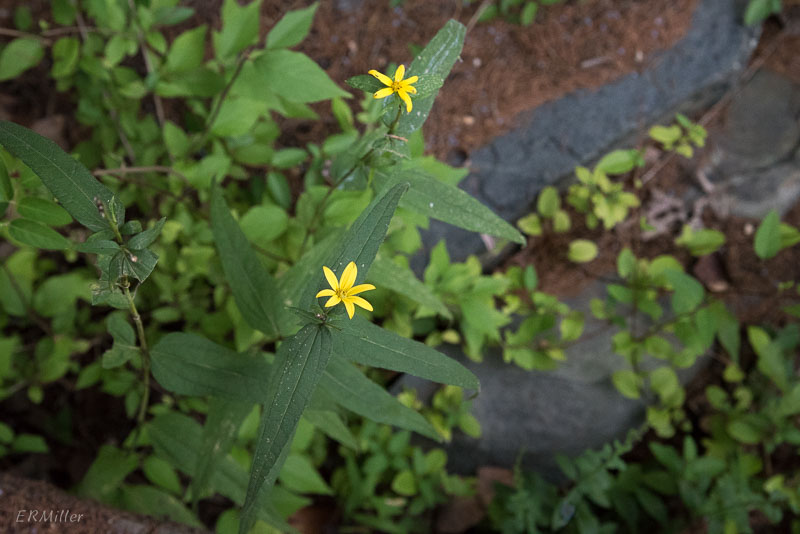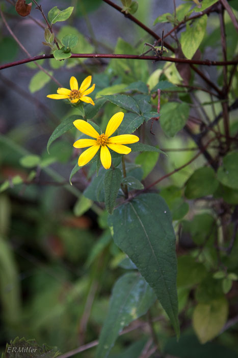 Thin-leaved sunflower (Helianthus decapetalus; Asteraceae) is what we call a DYC*; these species can be difficult to distinguish, but this one can be identified by bracts under the flower head that exceed the width of the disk (click on the image to see it larger) and very long, narrow leaf tips (“acuminate” is the technical term). The specific epithet is not to be taken literally; the typical ray floret (“petal”) count is in the range of 8 to 15.