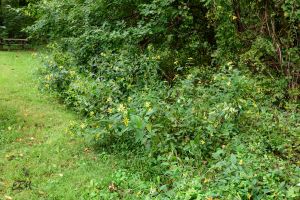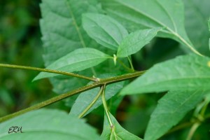 Hairy leafcup (Smallanthus uvedalia; Asteraceae) is another DYC, but this one is easily identified by the gigantic leaves with a unique shape. The few records in Maryland Biodiversity Project are mostly from the Coastal Plain and Piedmont, but a look at the USDA PLANTS Database distribution map makes me think that this species is under-reported. At any rate, I see hairy leafcup in the woods near openings in the canopy, close to the river but rarely in full sunlight. Usually I have to look up to see the flowers (I’m 5’5″ tall).