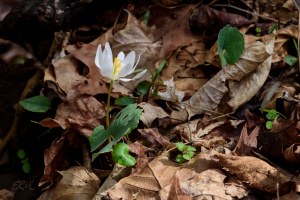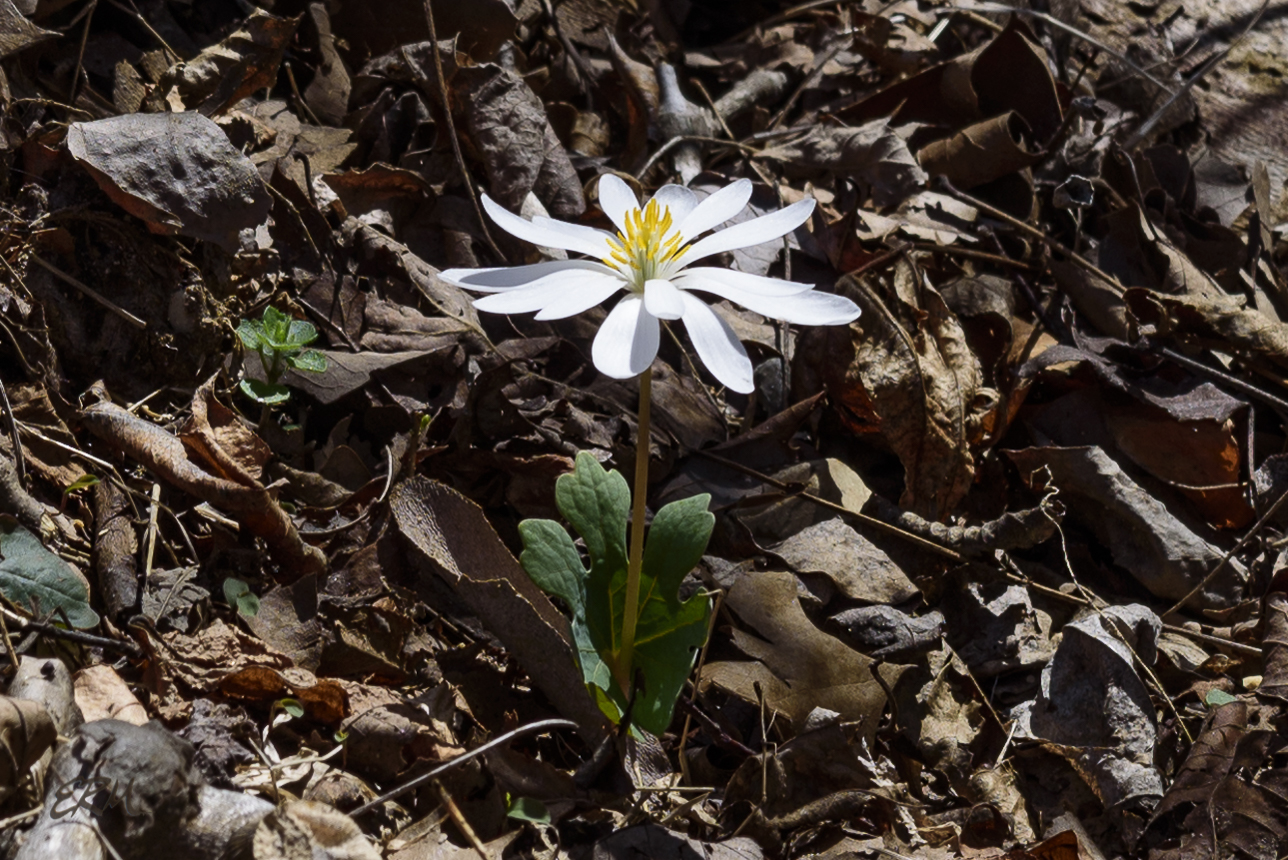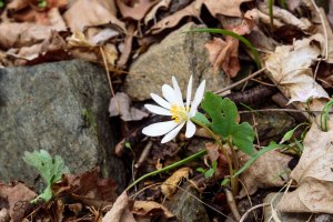 Bloodroot (Sanguinaria canadensis; Papaveraceae) is almost done blooming. You can find it in rich woodlands, usually in colonies.