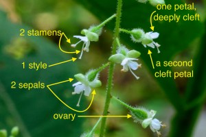 The flower has an unusual structure, with only two petals, so deeply cleft that they appear to be four, two sepals, two stamens, one style, and an inferior ovary.