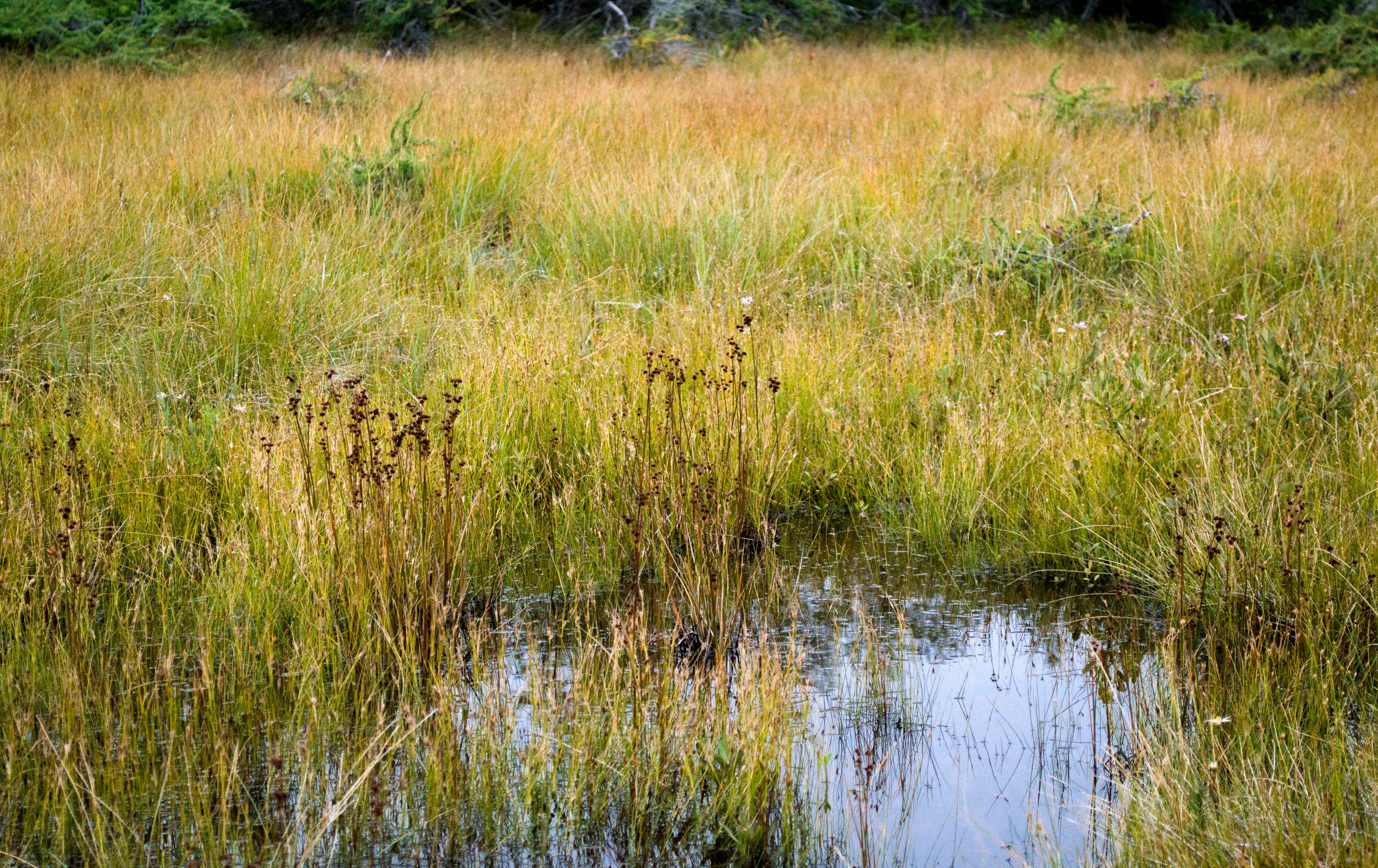 Looks like a grassland at the edge of the boreal forest, doesn’t it? Actually, it’s a slope fen; there’s water flowing very, very slowly under there. You can’t walk across it, but there is a boardwalk around it. There are a few open pools of water within.