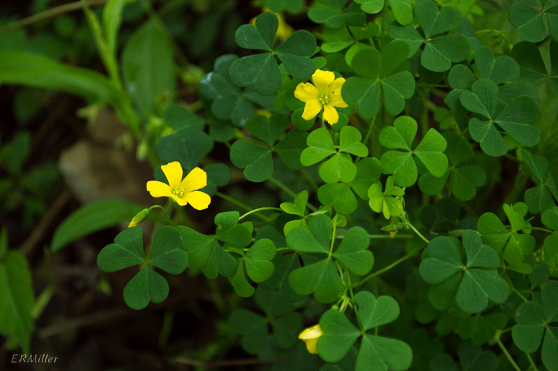 I’ve never bothered to key out a sample (maybe I will soon, when it isn’t raining; it won’t be hard to find), but the little plants that some people mistake for some sort of yellow clover are likely Oxalis stricta or O. corniculata, both of which are listed as weedy or invasive by several authorities. Oxalis species have leaves that resemble clover’s, with three heart-shaped leaflets, but clover is in the Fabaceae while Oxalis is in its own family, Oxalidaceae.