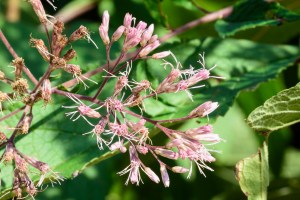 Joe-pye weed is another tall forb with showy flowers. I see it more often along the C&O Canal than along the river. There are two species found in the Maryland piedmont; this one is Eutrochium fistulosum, which prefers sunny, wet places. The other species (E. purpureum) prefers upland areas. Joe-pye weed is another aster family plant with only disc florets. By themselves they aren’t much to look at; it’s the huge masses of multi-flowered heads in multiple inflorescences that make the plants so showy.