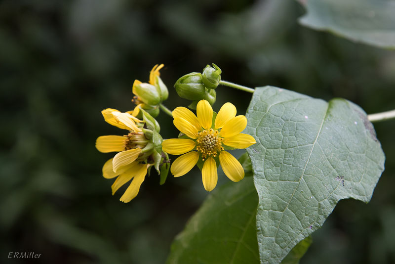 Hairy leafcup (Smallanthus uvedalia; Asteraceae) is another DYC, but this one is easily identified by the gigantic leaves with a unique shape. The few records in Maryland Biodiversity Project are mostly from the Coastal Plain and Piedmont, but a look at the USDA PLANTS Database distribution map makes me think that this species is under-reported. At any rate, I see hairy leafcup in the woods near openings in the canopy, close to the river but rarely in full sunlight. Usually I have to look up to see the flowers (I’m 5’5″ tall).