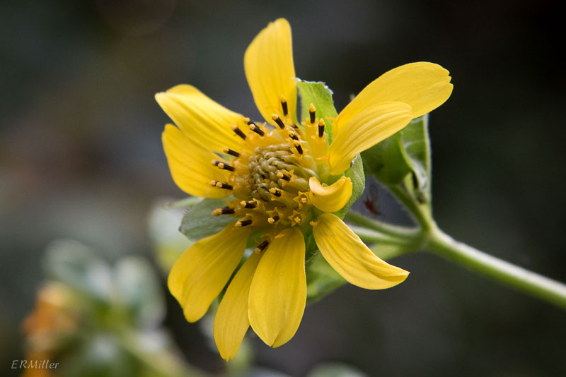Thin-leaved sunflower (Helianthus decapetalus; Asteraceae) is what we call a DYC*; these species can be difficult to distinguish, but this one can be identified by bracts under the flower head that exceed the width of the disk (click on the image to see it larger) and very long, narrow leaf tips (“acuminate” is the technical term). The specific epithet is not to be taken literally; the typical ray floret (“petal”) count is in the range of 8 to 15.
