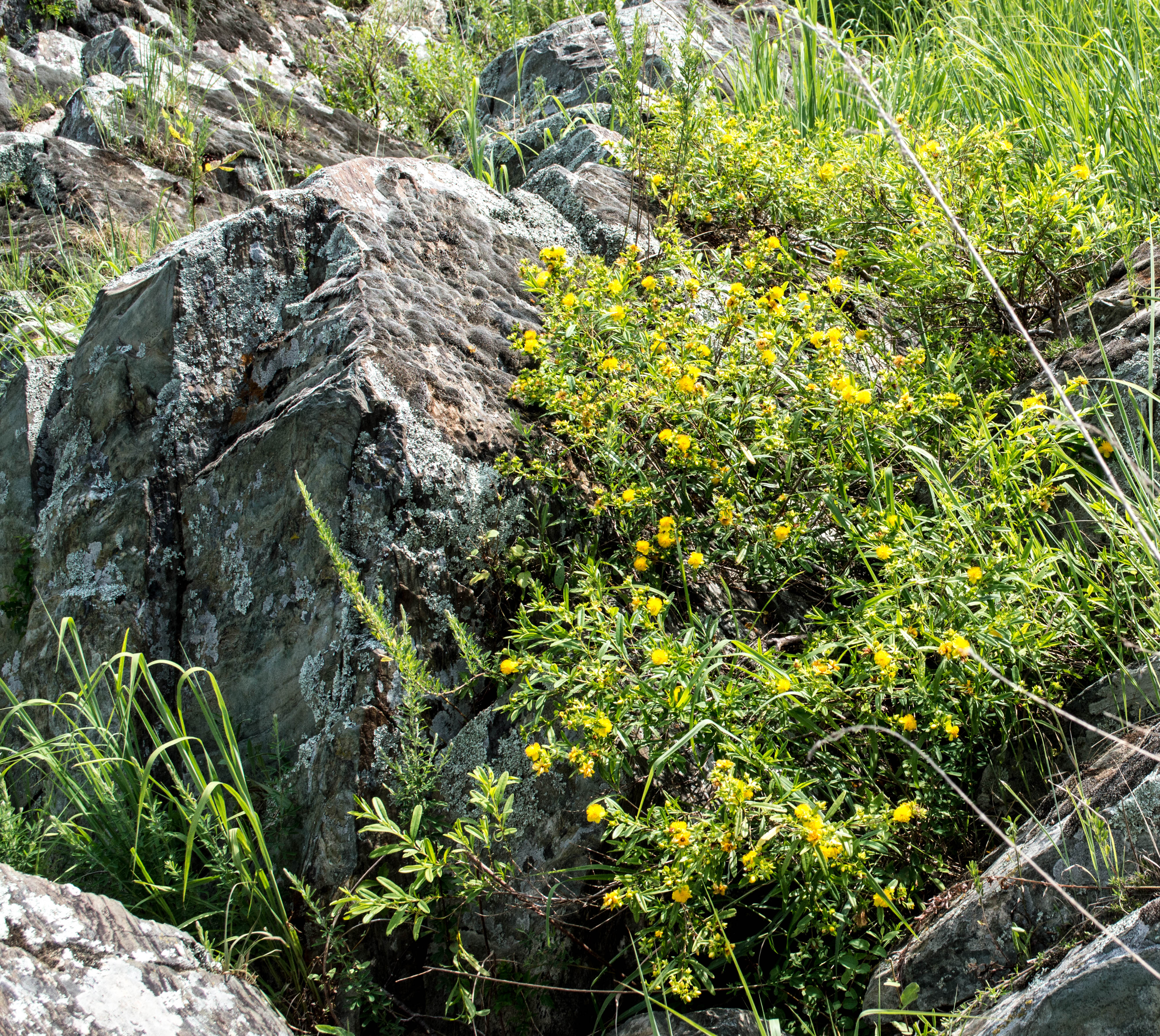 About eleven species (ten native, one alien) of Hypericum (St. Johnswort) can be found in the Maryland Piedmont. In many of the bedrock terraces in the Potomac Gorge I’ve seen good-sized stands of H. prolificum, aka shrubby St. Johnswort, like this: