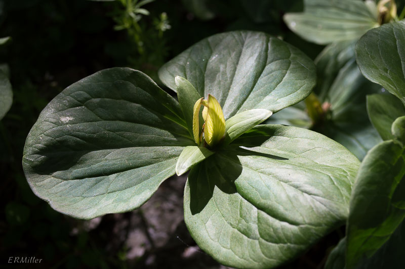 I know of two spots where white trout lilies grow. I spent more than an hour searching one of those areas after someone posted a picture of a white trout lily blooming. Couldn’t find it. Hiked to another area, shot the yellow trout lilies, then decided to go back for one more look. Pulled out my phone and searched for the picture, and sure enough, there were enough clues in it that I was able to narrow my search to a small area. Et voila! The one shown here in bud was from the other location, the day before.