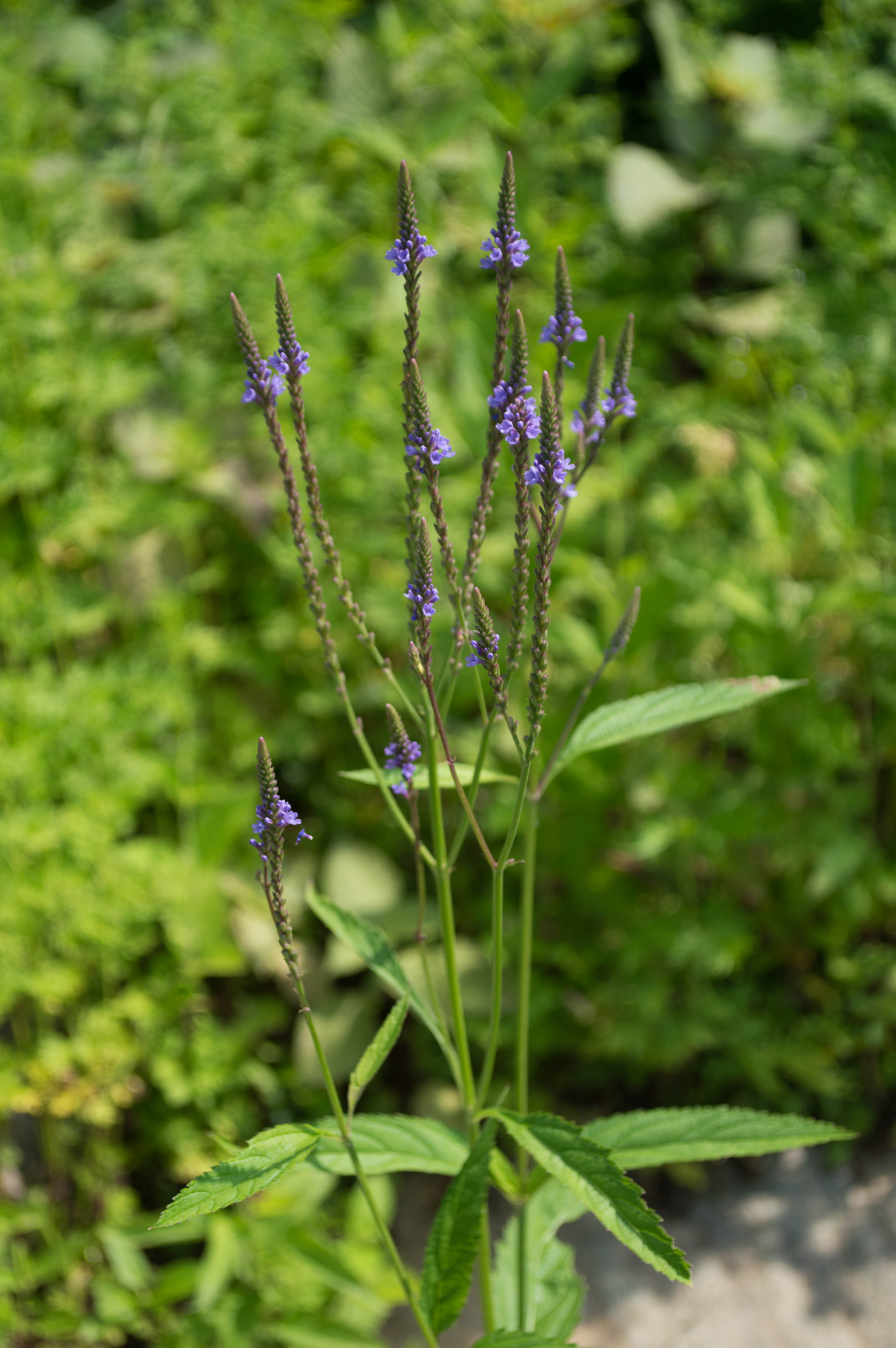 Blue vervain, also known as swamp vervain, likes wet soils and full sun, and can be found all across the US in two varieties. Some authorities consider it weedy in the West. It grows up to five feet tall, with flower spikes up to half a foot long; the individual flowers are about 1/4″ across.